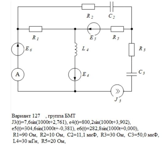 <b>ДОМАШНЕЕ ЗАДАНИЕ №1 <br />МЕТОДЫ АНАЛИЗА ЛИНЕЙНЫХ РАЗВЕТВЛЕНЫХ ЭЛЕКТРИЧЕСКИХ ЦЕПЕЙ ПРИ СИНУСОИДАЛЬНЫХ ВОЗДЕЙСТВИЯХ</b> <br />1.	Записать систему уравнений по первому и второму законам Кирхгофа в комплексной форме (НЕ РЕШАЯ) для заданной цепи. <br />2.	Рассчитать токи в заданной цепи методом контурных токов или методом узловых потенциалов. <br />3.	Рассчитать неизвестный ток в одной из ветвей методом эквивалентного источника. <br />4.	Построить векторную диаграмму токов для одного из узлов. <br />5.	Определить показания приборов. <br />6.	Составить уравнение баланса мощностей. Рассчитать комплексную мощность цепи для источников и нагрузок. <br />7.	В ответе указать значения токов в комплексной и во временной форме.<br /><b>Вариант 127</b>