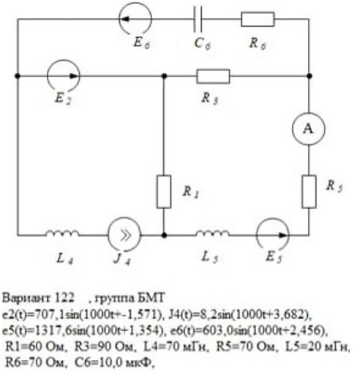 <b>ДОМАШНЕЕ ЗАДАНИЕ №1 <br />МЕТОДЫ АНАЛИЗА ЛИНЕЙНЫХ РАЗВЕТВЛЕНЫХ ЭЛЕКТРИЧЕСКИХ ЦЕПЕЙ ПРИ СИНУСОИДАЛЬНЫХ ВОЗДЕЙСТВИЯХ</b> <br />1.	Записать систему уравнений по первому и второму законам Кирхгофа в комплексной форме (НЕ РЕШАЯ) для заданной цепи. <br />2.	Рассчитать токи в заданной цепи методом контурных токов или методом узловых потенциалов. <br />3.	Рассчитать неизвестный ток в одной из ветвей методом эквивалентного источника. <br />4.	Построить векторную диаграмму токов для одного из узлов. <br />5.	Определить показания приборов. <br />6.	Составить уравнение баланса мощностей. Рассчитать комплексную мощность цепи для источников и нагрузок. <br />7.	В ответе указать значения токов в комплексной и во временной форме.<br /><b>Вариант 122</b>