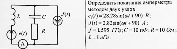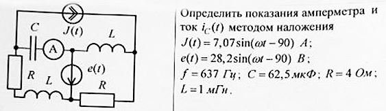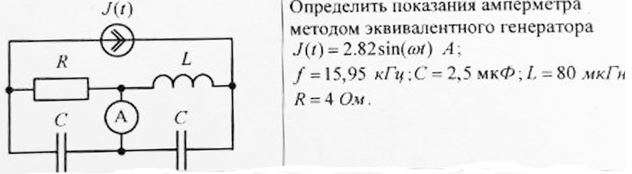Определить показания амперметра методом эквивалентного генератора. <br />J(t) = 2.82sin(ωt) A; f = 15.95 кГц; C = 2,5 мкФ; L = 80 мкГн; R = 4 Ом.