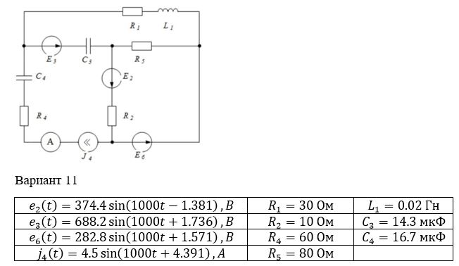 ДОМАШНЕЕ ЗАДАНИЕ №1 «МЕТОДЫ АНАЛИЗА ЛИНЕЙНЫХ РАХВЕТВЛЕННЫХ ЭЛЕКТРИЧЕСКИХ ЦЕПЕЙ ПРИ СИНУСОИДАЛЬНЫХ ВОЗДЕЙСТВИЯХ» Задание: 1. Изобразить комплексную схему замещения заданной электрической цепи. 2. Записать по законам Кирхгофа систему уравнений для определения неизвестных токов в ветвях электрической цепи. Внимание!!! Уравнения по законам Кирхгофа не решать. Достаточно только записать их. 3. Рассчитать неизвестные токи в заданной схеме методом контурных токов и методом узловых потенциалов. Сравнить результаты. 4. Определить неизвестный ток в одной из ветвей (по выбору студента) методом эквивалентного генератора. Внимание!!! Следуем выбирать ветвь без источников ЭДС и тока. 5. Построить векторную диаграмму токов и топографическую диаграмму напряжений. Диаграммы должны быть построены в одних осях. 6. Определить напряжение на источнике тока. 7. Провести проверку баланса мощностей для активных, реактивных и полных мощностей. Вариант 11